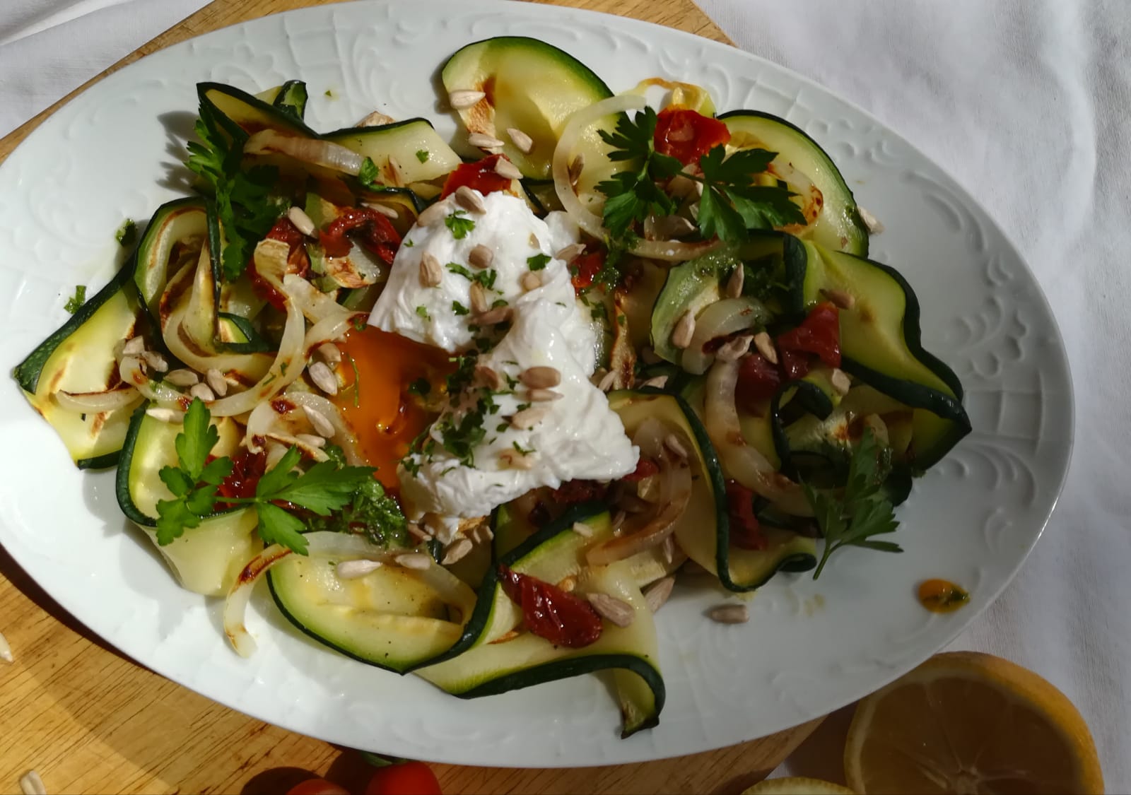 - Start to plate the dish with the grilled zucchini and onion, spread the sunflower seeds and the dried tomatoes on the grilled vegetables and the poached egg into the middle of the plate. Pour the dressing over the plate and garnish with some parsley.